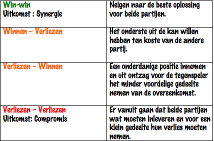 Nu lijkt het misschien heel aantrekkelijk om te kiezen voor de Winnen-Verliezen benadering. Voor een eenmalige overeenkomst of voor een overeenkomst op korte termijn is het zeker een goede benadering, maar als je voor een relatie op lange termijn wilt gaan is Winnen-Verliezen niet de juiste benadering. De partij die verliest komt er namelijk achter dat die verloren heeft en te weinig uit de overeenkomst heeft gehaald. De verliezende partij gaat dus liever op zoek naar een partij waarbij er meer uit een overeenkomst gehaald kan worden.