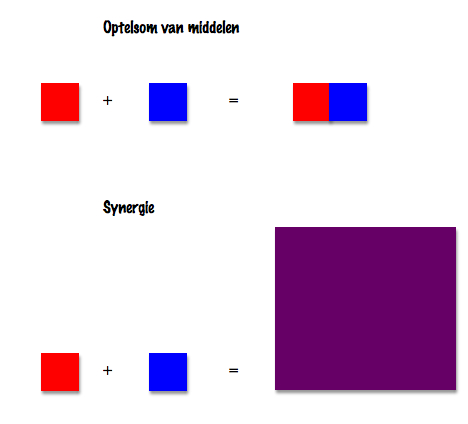 Laat ik eerst synergie simpel en duidelijk definiëren; Er is sprake van synergie als de uitkomst hoger is dan de losstaande delen bij elkaar opgeteld. Nog simpeler gezegd; 1+1=3 of meer.