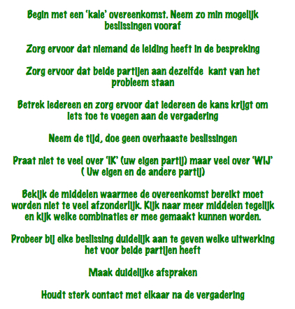 Twee partijen komen bijeen in een vergadering. Beide partijen willen een overeenkomst bereiken. Naast hun eigen belangen hebben beide partijen er belang bij dat er een overeenkomst bereikt wordt. Voor een partij zijn er verschillende benaderingen mogelijk.