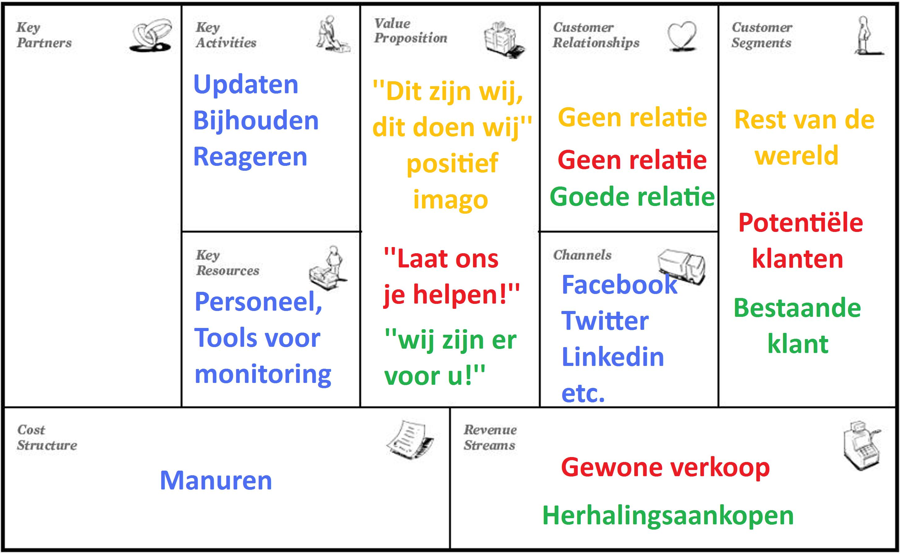 In de bovenstaande afbeelding is te zien hoe het canvas is ingevuld voor het inzetten van social media. De 3 verschillende ”klantsegmenten” hebben een aparte kleur gekregen, zo kan ook de link gelegd worden tussen de verschillende klantsegmenten, de waarde propositie die aangeboden wordt, de relatie en de inkomsten.