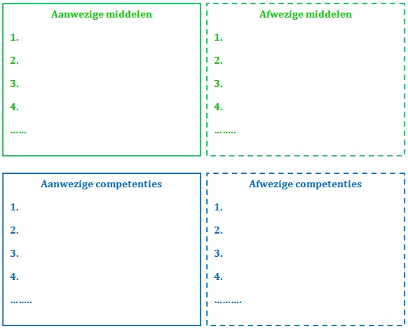 Op dezelfde manier als de formulering van de trends en ontwikkelingen moet er een opsomming worden gemaakt van de aanwezige competenties en middelen.