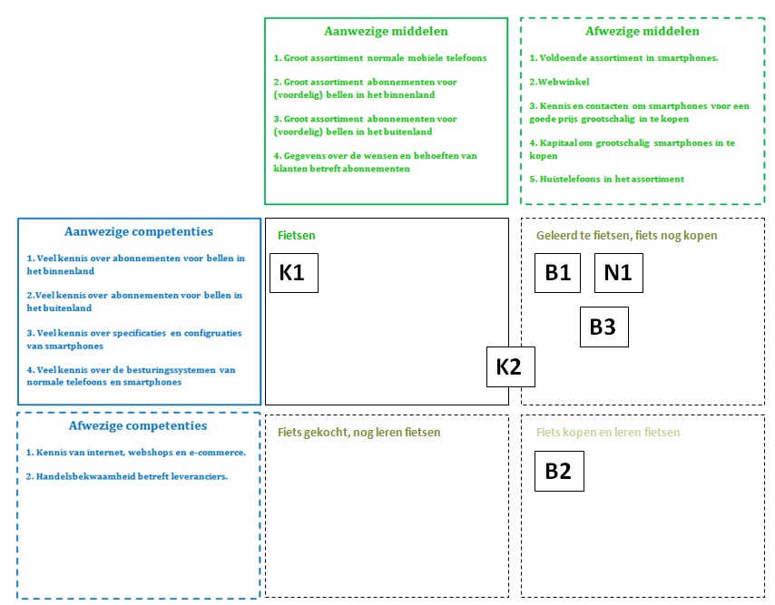 Toestellen met IOS en Android zijn vooral smartphones. De ondernemer heeft zeer weinig smartphones in het assortiment en kan dus vrijwel niet in de stijgende behoefte naar die twee besturingssystemen van de afnemer voorzien (afwezig middel). De ondernemer heeft wel veel verstand van smartphones en de besturingssystemen ervoor (aanwezige competentie)[2].