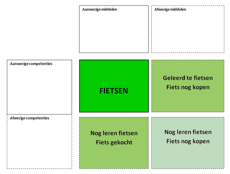 Als de FIETS-Matrix is ingevuld ontstaat er een overzicht van wat de onderneming moet doen om op basis van een bepaalde trend te innoveren. In de sector ‘Fietsen’ kan een innovatie gevonden worden die het dichtst bij de hand ligt. Bij de sectoren ‘Geleerd te fietsen, fiets nog kopen’ en ‘Fiets gekocht, nog leren fietsen’ moet de onderneming bepaalde competenties of middelen aantrekken om een innovatie op dat kansgebied te doen. In de sector ‘Fiets kopen en leren fietsen’ ligt een innovatie die het verst weg is voor de onderneming. Er zullen nieuwe middelen en soorten kennis aangetrokken moeten worden om een innovatie te doen in die richting.