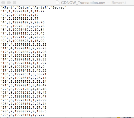- Transactiedataset: CDNOW.csv;