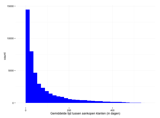 Deze visualisatie laat per klant de gemiddelde aantal dagen zien tussen zijn of haar aankopen. Het liefst zie je natuurlijk dat aan de linkerkant van de grafiek de staven zo hoog mogelijk zijn, dit zou namelijk betekenen dat klanten frequent (niet veel dagen tussen hun aankopen) kopen.
