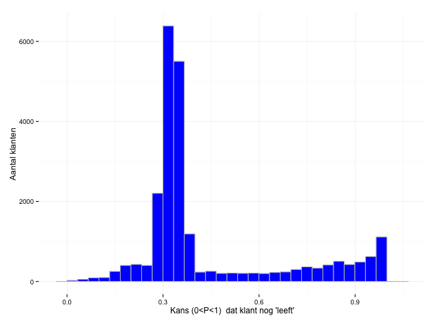 Deze grafiek geeft informatie over levende en dode klanten in het klantenbestand. Met levend en dood wordt bedoeld dat een klant dood is als hij hoogstwaarschijnlijk geen aankopen meer gaat doen bij jouw winkel (bijvoorbeeld omdat hij dat tegenwoordig bij een concurrent doet of gewoon is afgehaakt). Door het zelflerende voorspellingsmodel kan deze weergave met enkel transactiedata van klanten gemaakt worden. Met deze informatie over klantgedrag zou je kunnen sturen zodat je zoveel mogelijk levende klanten hebt. In deze grafiek wil je de staven zoveel mogelijk aan de rechterkant hebben aangezien de kans (P) dat een klant levend is oplopend op de x-as wordt weergegeven en het aantal klanten op de y-as.