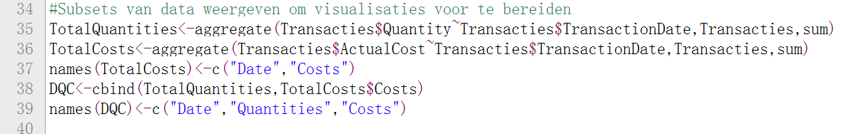 We maken subsets aan van de tabel. Het doel is om een tabel te maken die per datum de totaal opgetelde (voor alle producten die dag) Quantity en Cost.