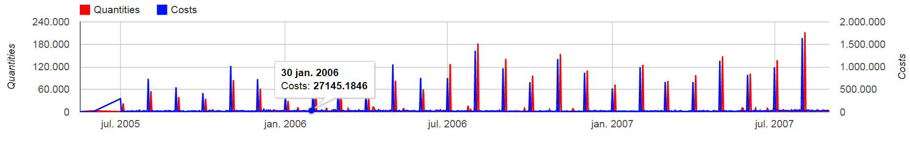 Nu gaan we de eerste visualisatie voorbereiden en laten zien. We willen een grafiek maken die twee x-assen bevat en één y-as met de datum. Zo hebben we in één weergave een overzicht van de ontwikkeling van de Quantity en de Cost voor alle producten.
