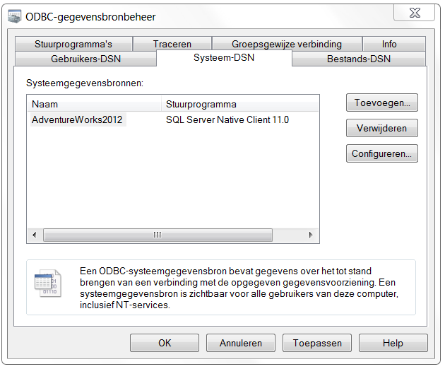 Ga naar de “Systeem-DSN”-tab. Voeg daar een nieuwe gegevensbron in. Het onderstaande screenshot geeft het uiteindelijke resultaat aan als je de stappen voor het toevoegen van een DSN hebt doorlopen. Uiteindelijke is er een Systeem DSN met de naam “AdventureWorks2012” aangemaakt met SQL Server Native Client 11.0 als stuurprogramma.