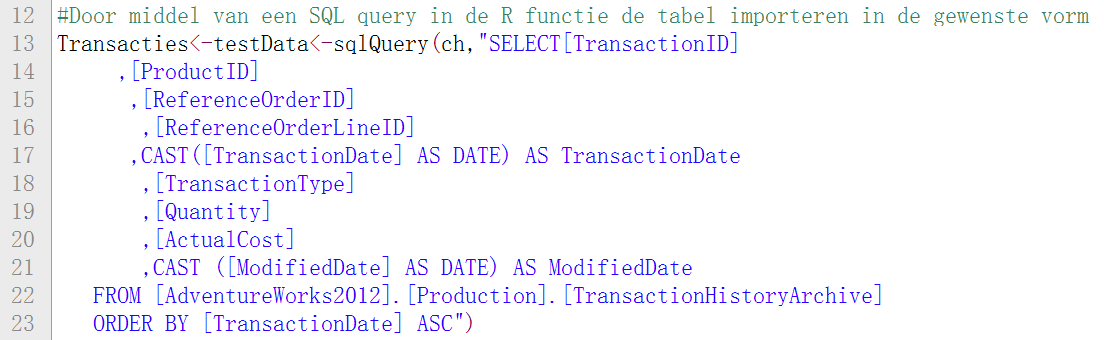 De Adventure Works database wordt gebruikt als case. Uit deze database gebruiken we de tabel [Production].[TransactionHistoryArchive] , een mooie tabel met transactie historie over de verkochte producten die zich uitstekend leent om wat leuke analyses op te doen. Je kunt de query in de screenshot gebruiken om deze tabel te selecteren. Dit is puur om even te zien hoe de dataset er uit ziet. In R gaan we namelijk dezelfde query gebruiken om de tabel in te laden.