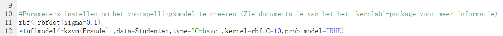 Nu de tabel met studentengegevens is geïmporteerd in R, trainen we het voorspellingsmodel. Zie het stukje “ ksvm(Fraude~ ”, welk aangeeft dat de variabele Fraude wordt voorspelt op basis van de al voorgaande variabelen.