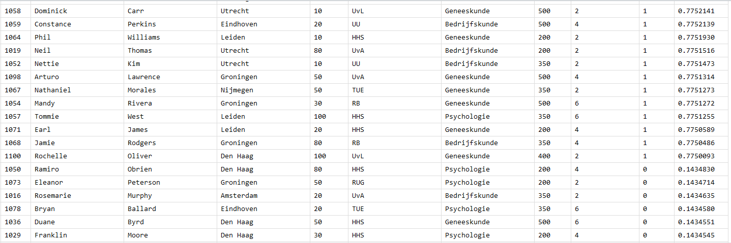 Nu het voorspellingsmodel is gemaakt, kunnen we voorspellingen gaan doen. We voorspellen gelijk in 1 keer de hele dataset zodat we uiteindelijk een nieuwe dataset krijgen met elke student en diens kans op fraude als laatste kolom.