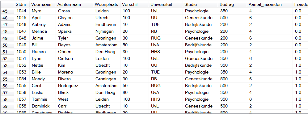 Je kunt gewoon zelf een dataset verzinnen, dat heb ik zelf ook gedaan. Alle namen zijn door een random name generator gemaakt en alle namen van scholen en afstanden heb ik random ingevuld. Per rij heb ik ten slotte aangegeven of er sprake was van fraude of niet (0 is nee en 1 is ja). De resultaten heb ik minder willekeurig verzonnen omdat je zelf wilt bepalen hoe de situaties van fraude en geen fraude zijn verdeeld. Je kunt eenvoudig zelf zo’n dataset maken. Als je daar geen tijd voor heb kun je de dataset die ik gebruikt heb hier downloaden (je kunt deze dataset dan als csv-bestand importeren in R).