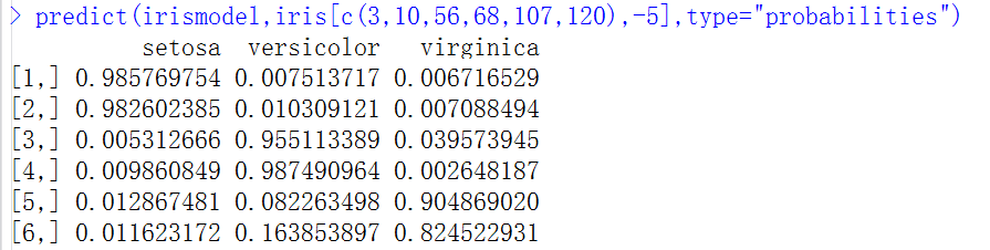 Voor willekeurige rijen in de iris dataset worden nu voorspellingen teruggegeven waarbij voor ieder soort (Species) de waarschijnlijkheid wordt weergegeven dat het dat soort bloem is: