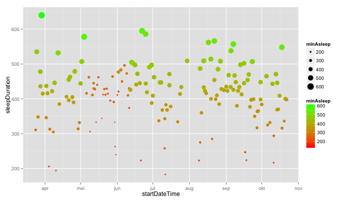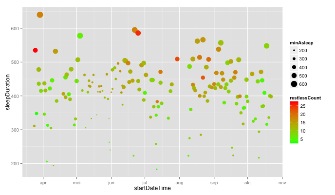 The colors in the chart indicate how many times I am restless. Overall, you can see the longer I sleep the more times I am restless. So it is not the case that I am less restless if I am longer in bed. In some cases you can see that I am quite restless even if I am asleep for a short period of time, which is kind of bad news. There are also points where the quality of my sleep was very good. These are the light green points that are quite large around the area of 400 minutes.
