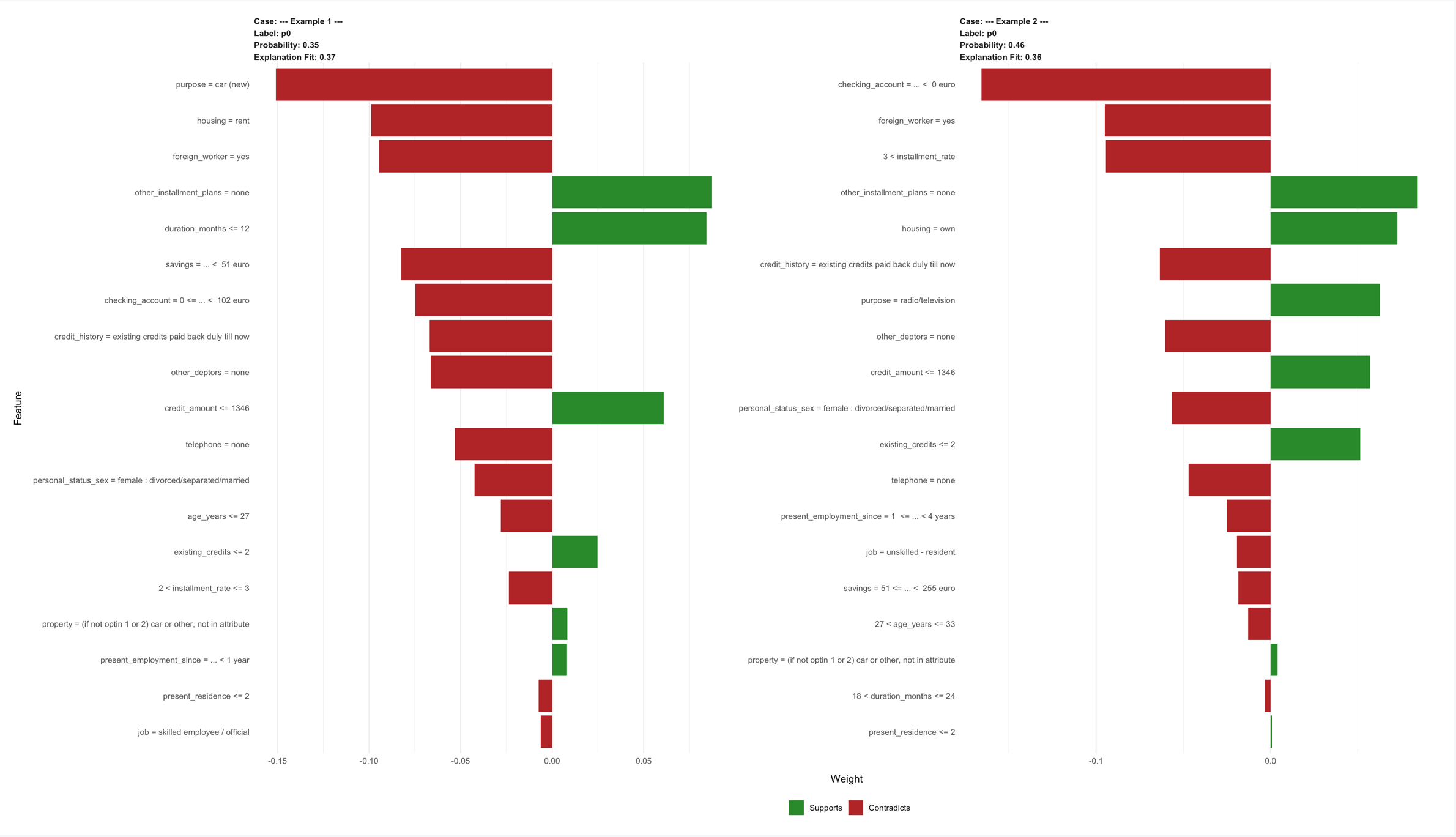 Als je de bovenstaande afbeelding vergroot, kun je voor deze twee situaties de onderbouwingen zien. De bovenste twee voorspellingen geven achter Probabilityaan dat de kansen respectievelijk 35% en 46% zijn dat de personen de lening kunnen terugbetalen. Fit geeft in dit geval aan hoe betrouwbaar deze explanations zijn.